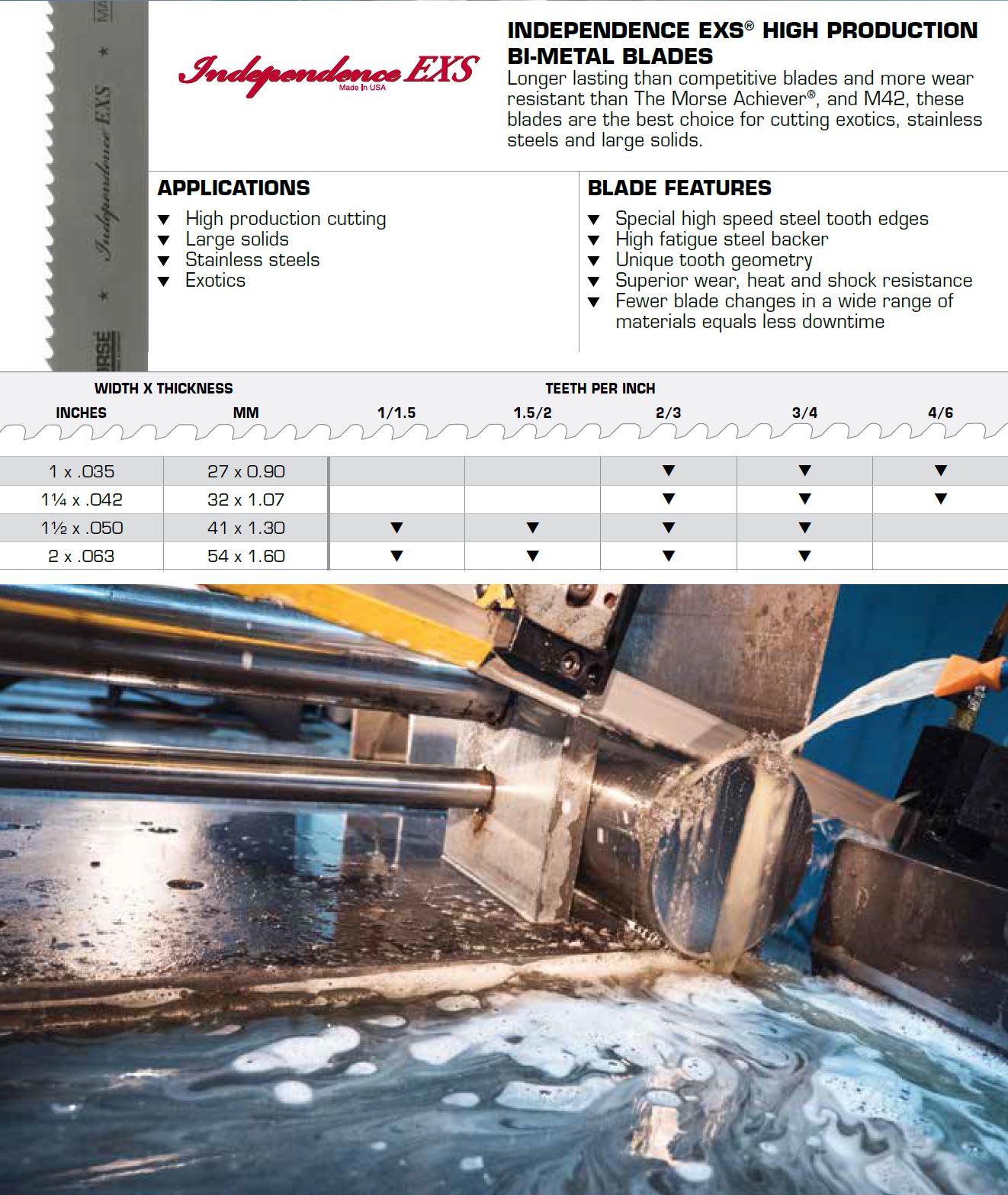 Lasting longer than competitive blades, Independence EXS bi-metal band saw blades are the best choice for production cutting of exotics, stainless steel and large solids.